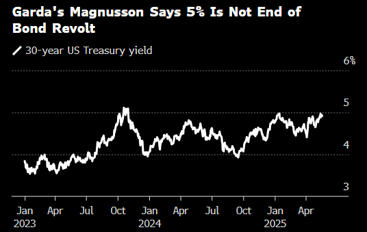 穆迪取消了对美国的最高信用评级后,30年期美债收益率周一一度再次升破5%。身为规模约120亿美元对冲基金的首席投资官,Magnusson表示这只是未来走势的冰山一角。
