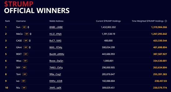 不过要挤进前25名,只需要在活动期间平均持有约17万个“特朗普币”就行了。而作为参加特朗普晚宴的门槛,第220名参与者在活动期间日均持有4196个“特朗普币”。