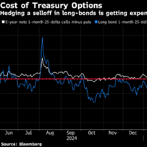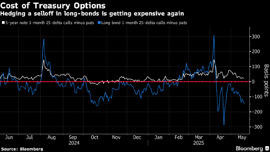 防范长期美债进一步下跌风险的费用,目前已达到4月以来的最高水平;特朗普激进贸易政策的潜在经济影响,在该月冲击了市场。当前的期权偏度走势表明,交易员正在推高看跌期权相对于看涨期权的价格。