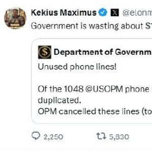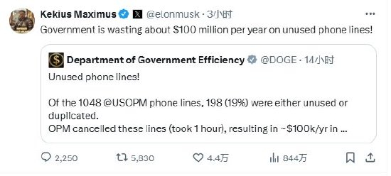 马斯克转发了美国政府效率部(DOGE)在X上的官方账号的一条帖子,后者表示,一项内部审计发现,美国人事管理办公室(OPM)的1048条电话线中,有198条未使用或重复使用,约占总数的19%。