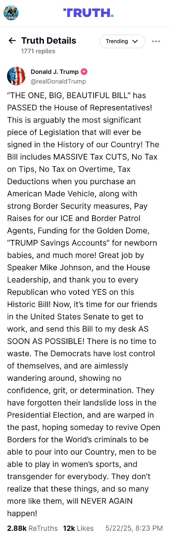 特朗普敦促美参议院:“尽快”提交税改法案 环球市场播报 05月22日20:46 关注 听新闻 相关新闻:特朗普税改法案在众议院涉险过关 提交参议院 美国总统特朗普在Truth Social上发文称,参议院是时候“开始行动了,尽快将这项法案送到我办公桌上”。 特朗普说,“没有时间可以浪费了”。