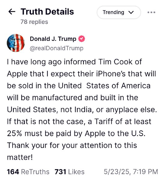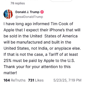 “我早就通知过苹果公司的蒂姆·库克,我希望他们在美国销售的iPhone在美国生产制造,而不是在印度,或其他任何地方,”特朗普周五在Truth Social上发帖称。“如果不是这样,苹果必须向美国支付至少25%的关税,感谢你们对此事的关注!”