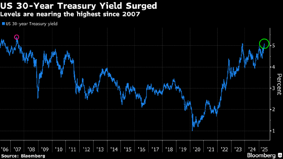 美国债券收益率本周飙升,美国总统特朗普的税改计划引发外界的担忧,在未来几年中,美国本已居高不下的预算赤字将再增加数万亿美元,目前全球投资者对美国资产的兴趣正在减弱。自从穆迪上周末让美国失去最后一个最高信用评级以来,美国国债的市场情绪也受到了打击。