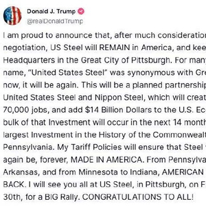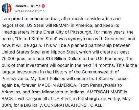 “我自豪地宣布,在经过深思熟虑和谈判之后,美国钢铁将继续留在美国,总部依然在伟大的匹兹堡市,”特朗普周五在Truth Social上表示,“我的关税政策将确保美国钢铁永远是美国制造。”