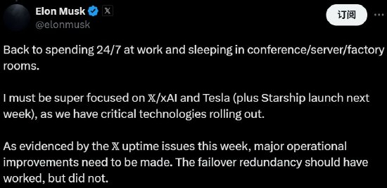 “又得全天候工作,睡在会议室/服务器/工厂里了。我必须超级专注于 X/xAI 和特斯拉(再加上下周的星际飞船发射),因为我们有关键技术正在推出,” 马斯克在一篇 X 帖子中说 。
