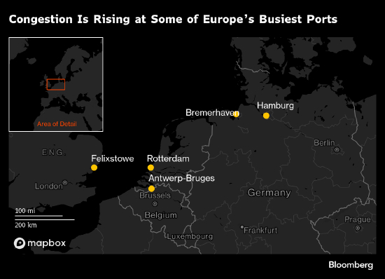 北欧主要航运枢纽的港口拥堵问题正在恶化。由于劳动力短缺和莱茵河水位低,不莱梅港、安特卫普和汉堡的泊位等待时间显著延长。