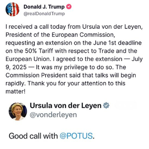 两天前,特朗普表示将从6月1日起对欧盟进口商品征收50%的关税。今年4月特朗普暂停了最初对欧盟征收的20%关税,开始为期90天的谈判窗口期,谈判原定7月9日结束。冯德莱恩办公室证实是她主动联系特朗普的。冯德莱恩的话表明,欧盟委员会的立场可能会转变,倾向于寻求一个潜在的妥协方案