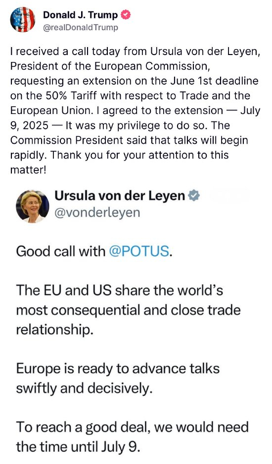 美国总统特朗普表示,欧盟请求延长贸易谈判的窗口期,已同意将截止日期延长至7月9日。上周特朗普表示将从6月1日起对欧盟进口商品征收50%的关税。
