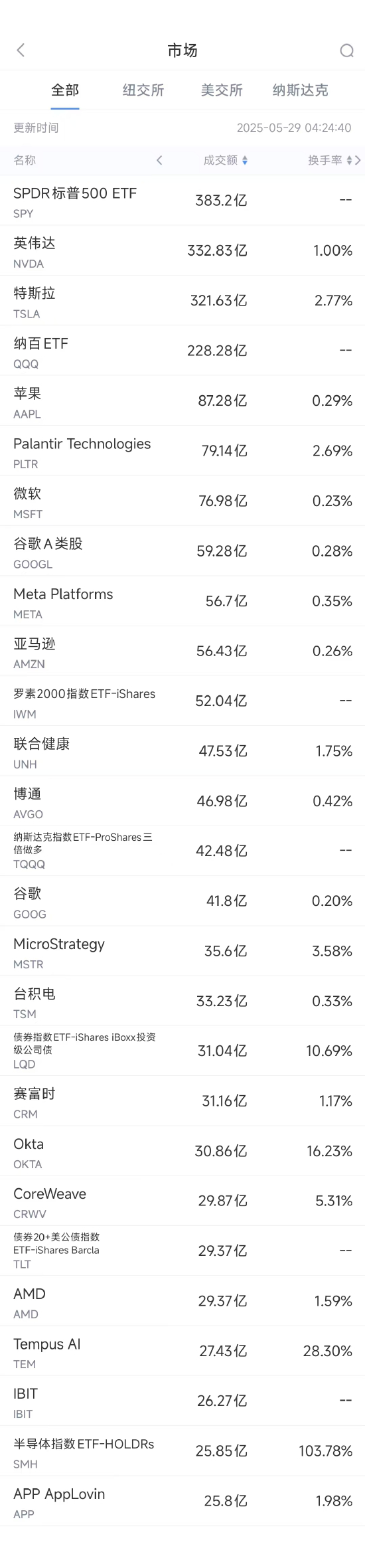 5月28日美股成交额前20:英伟达公布财报前小幅收跌0.5%