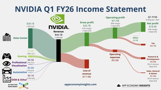 盈利方面,一季度H20芯片的出口限制对英伟达产生明显影响。调整后EPS增长33%,不到前一季71%增速的一半,0.81美元的EPS较分析师预期低将近13%。但若剔除H20的影响,EPS就回升到0.96美元,还比分析师预期的0.93美元高逾3%。