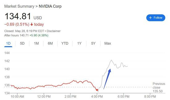 财报公布后,周三收跌约0.5%的英伟达股价盘后跳涨,盘后先曾涨超3%,涨幅收窄到3%以内之后又扩大,曾涨超5%。