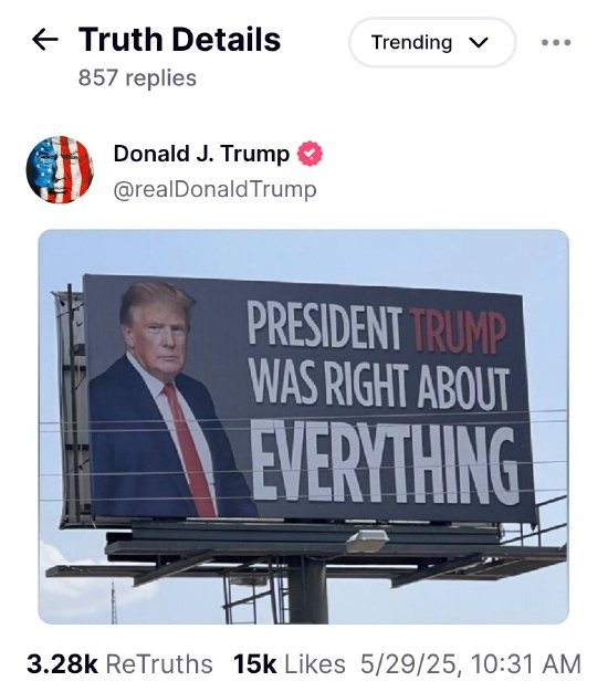 美国总统特朗普在社交媒体发布一张配有“特朗普总统什么都对”的图片,疑为对关税禁制的回应。