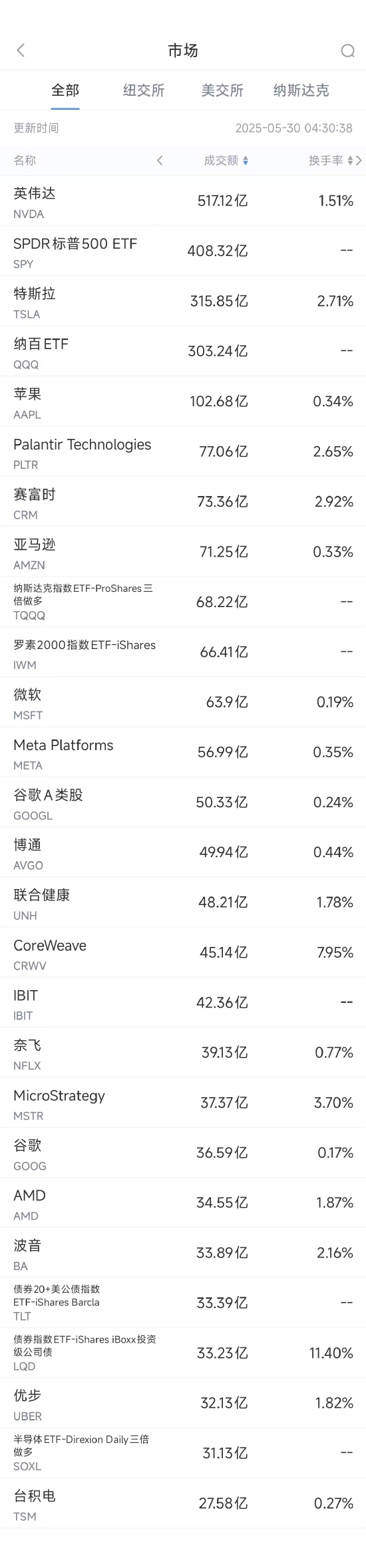 5月29日美股成交额前20:CoreWeave重挫9%,巴克莱称其短期上涨空间有限