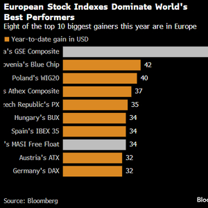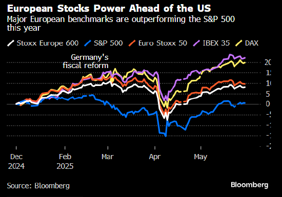 彭博汇编的数据显示,今年前五个月,全球表现最佳的 10 个股票市场中有 8 个位于欧洲。其中,德国 DAX 指数以美元计价涨幅超过 30%,斯洛文尼亚、波兰、希腊和匈牙利等外围市场也榜上有名。