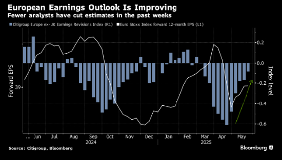 企业盈利是一大亮点。彭博情报(Bloomberg Intelligence)数据显示,摩根士丹利资本国际欧洲公司(MSCI Europe)第一季度利润增长 5.3%,而此前市场预期为下降 1.5%。尽管许多高管鉴于贸易不确定性挥之不去而调低了前景,但过去几周下调盈利预测的分析师减少,这表明最糟糕的下调可能已经结束。
