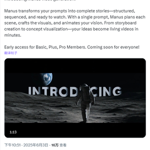 Manus以其人工智能(AI)服务能够像人类一样执行多步骤任务而闻名。该公司表示,用户现在可以使用文本指令生成视频。Manus在X平台上表示,其AI代理可以在几分钟内将文本命令转换为井然有序的视频故事。