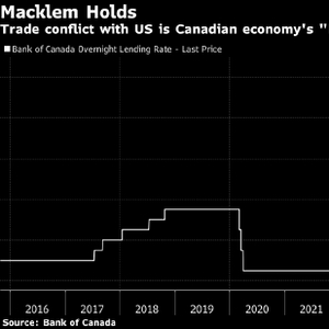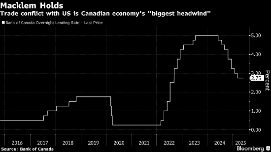 由行长Tiff Macklem领导的央行官员周三把政策利率维持在2.75%不变,符合市场及多数接受彭博调查的经济学家预期。