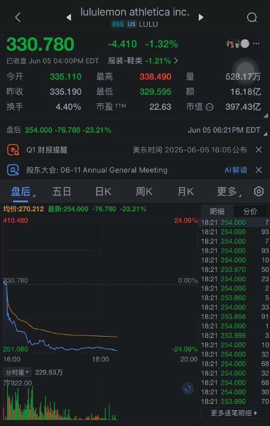 Lululemon因削减全年盈利指引并提及“动态宏观环境”股价暴跌23%