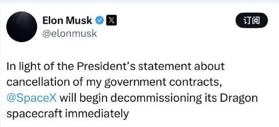 马斯克对此回应称:“鉴于总统关于取消我的政府合同的声明,spacex将立即开始让龙飞船退役。”据了解,当前美国的载人航天活动极大依赖SpaceX的“龙”飞船。