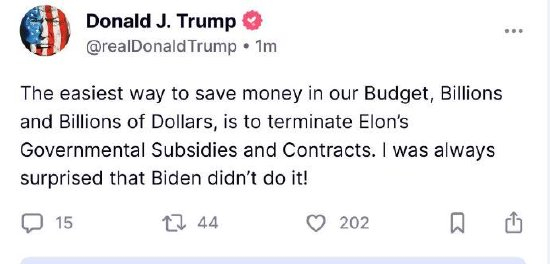 特朗普还威胁要终止马斯克的政府合同,他说:“在我们的预算中节省数百亿、数千亿美元最简单的方法,就是终止马斯克的政府补贴和合同。我一直很惊讶拜登居然没这么做!”
