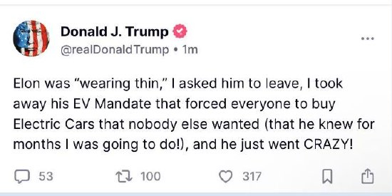 对马斯克此番表态,特朗普也通过社交平台回怼。“埃隆正‘失去耐性’,我让他离开,我取消了他的电动汽车强制令,强制所有人都买没人想要的电动汽车(他几个月前就知道我会这么做!),然后他就疯了!”特朗普在Truth Social上写道。