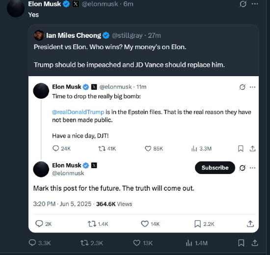 马斯克随后向特朗普发动了一波更猛烈的攻击,他表示:“是时候引爆真正的重磅炸弹了,特朗普总统在爱泼斯坦一案的文件里。这才是文件未被公开的真正原因。”