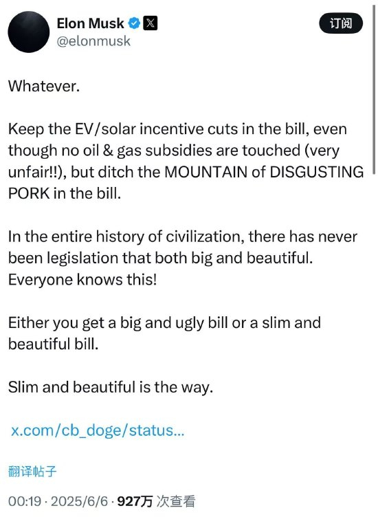 他说:“保留法案中削减电动汽车和太阳能激励措施的条款吧,尽管对石油和天然气的补贴分毫未动(太不公平!),但请去掉法案中堆积如山的令人恶心的‘猪肉’(指政治分肥项目)。 纵览整个文明历史,不存在“大而美”的立法。要么搞一个“大而丑”的法案,要么搞一个“瘦而美”法案,而后者才是出路。”