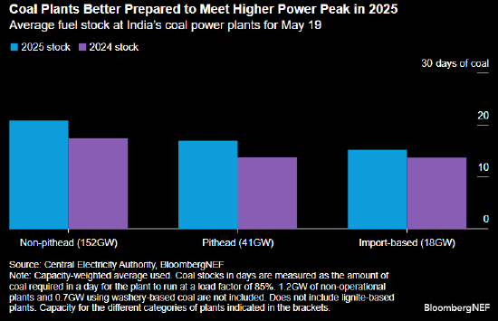 非坑口电厂——那些依靠陆路运输方式从距离遥远的煤矿获得燃料供应的电厂——的库存略高于坑口电厂。非坑口电厂占印度燃煤电厂装机容量的近四分之三,其平均库存足以让电厂比2024年多运行三天。使用进口煤炭的发电厂的燃料库存也高于去年,但差距仅为使用国产煤炭发电厂的一半左右。