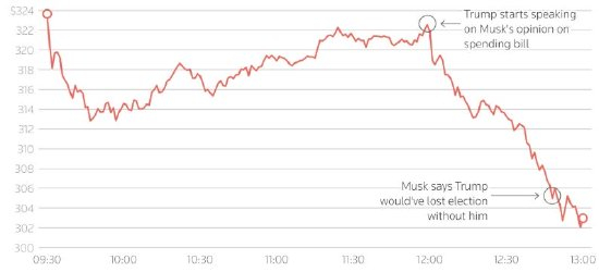 马斯克与特朗普互呛后特斯拉暴跌 空头大赚约40亿美元