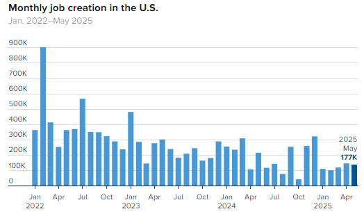 美国劳工统计局周五发布的数据显示,尽管消费者和企业对关税及可能放缓的经济形势保持警惕,但 5 月就业市场降温幅度轻微。
