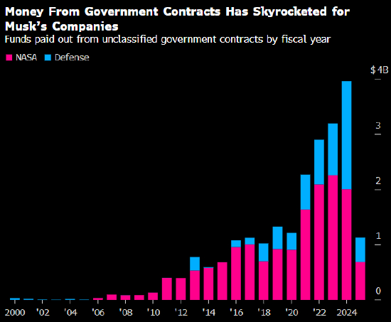 根据政府数据,估值3500亿美元的SpaceX自2000年以来已从国防部和NASA获得超过220亿美元的非机密合同。SpaceX为五角大楼发射关键国家安全卫星,美国正依赖马斯克领导的公司在两年内开发载人登月航天器。