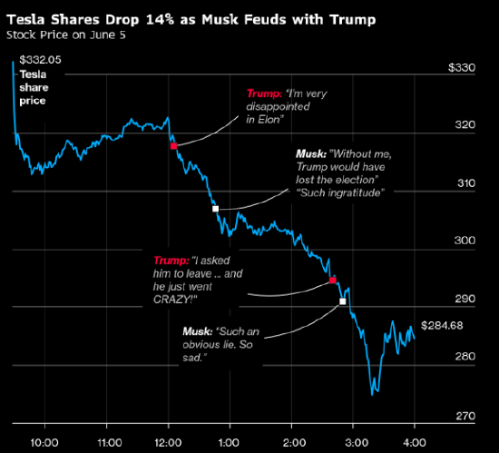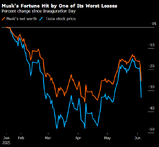 因为与特朗普的公开争执,马斯克一天之内个人净资产缩水340亿美元,创亿万富豪指数历史第二大单日财富损失,仅次于2021年11月的崩盘。特斯拉周四市值蒸发1530亿美元,股价周五在马斯克情绪缓和后有所回升。