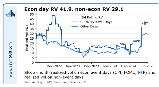 根据Asym 500整理的数据,过去三个月,标普500指数在CPI报告、政府月度就业数据及美联储利率决议发布当日的平均实际波动率接近42%,而其他交易日为29%。