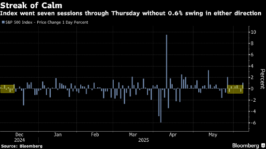 尽管标普500指数距离纪录新高仅有2.3%的距离,但该指数上行乏力,在6000点这一关键心里关口遇阻。根据机构汇总的数据,截至上周五,该股指已连续七个交易日涨跌幅均未超过0.6%,创下去年12月以来的最长一段平静期。