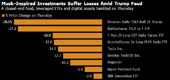随着两人矛盾公开,短短数小时内,以马斯克为主题的一个松散的交易网络 —— 以及部分与特朗普相关的交易 —— 便土崩瓦解。狗狗币大跌10%;一只以SpaceX探索项目为卖点的公开交易基金下跌13%;通过杠杆押注马斯克相关项目、以放大收益的投资损失了四分之一或更多价值。特朗普的媒体公司股价也出现下跌。