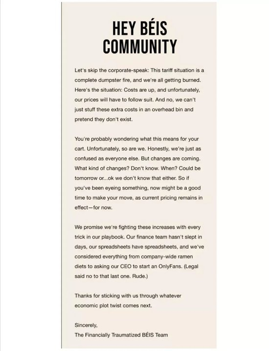 上个月,进口箱包销售商 BÉIS 因其关于不可预测的关税政策的坦率邮件在领英上走红。