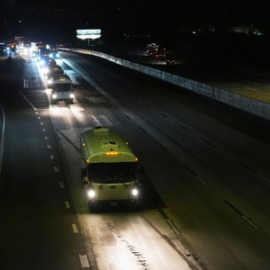 6月 9 日,一队巴士离开加利福尼亚州二十九棕榈村海军陆战队基地后,沿着 10 号州际公路行驶。