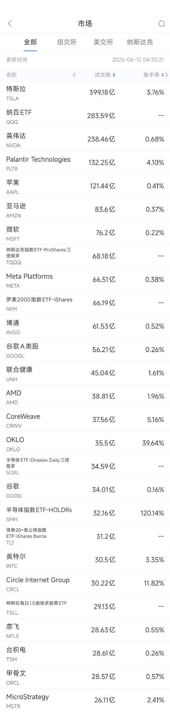6月11日美股成交额前20:特斯拉四连涨,马斯克向特朗普道歉