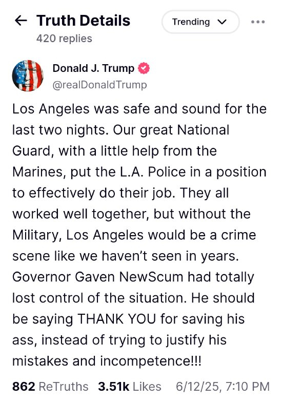 特朗普在Truth Social发帖称“过去两晚,洛杉矶安全无恙,”美国总统特朗普表示,并称赞国民警卫队和海军陆战队的表现。