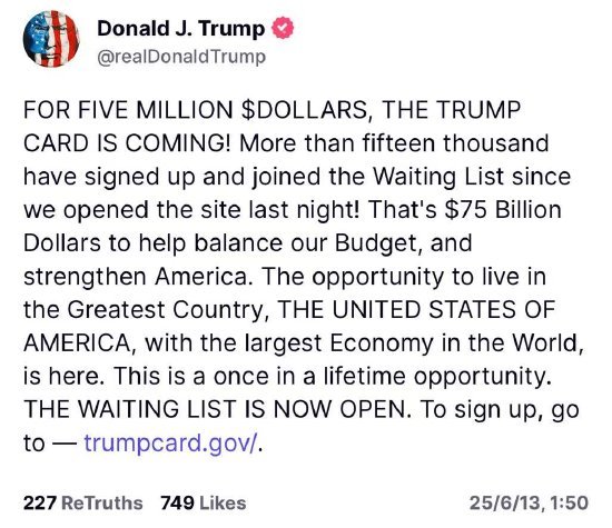 美国总统特朗普:五百万美金的“特朗普卡”来了!自从我们昨晚开放网站以来,已经有一万五千多人注册并加入了等候名单!这750亿美元将帮助我们平衡预算,增强美国的实力。生活在世界上最大的经济体、最伟大的国家的机会就在这里。这是千载难逢的机会。等候名单现已开放。