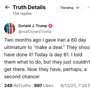 “两个月前,我给伊朗60天的最后通牒,要求他们‘达成协议’。他们本该那么做的!”美国总统特朗普发帖称。