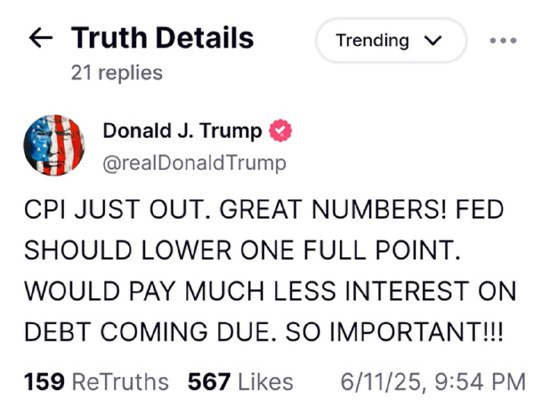 美国总统特朗普在社交媒体发帖:“刚刚公布的CPI数据非常强劲。美联储应该降息整整一个百分点,这样到期债务的利息支付就会少很多。”
