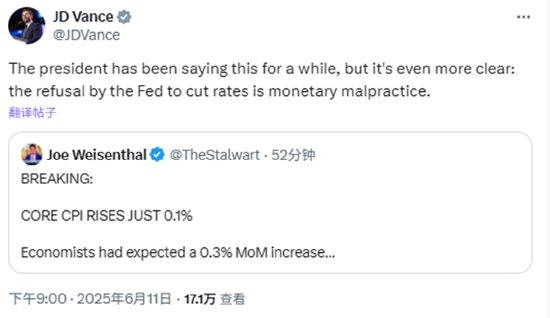 美国副总统万斯随后也在X发帖称,“美联储拒绝降息是货币政策失当行为。”