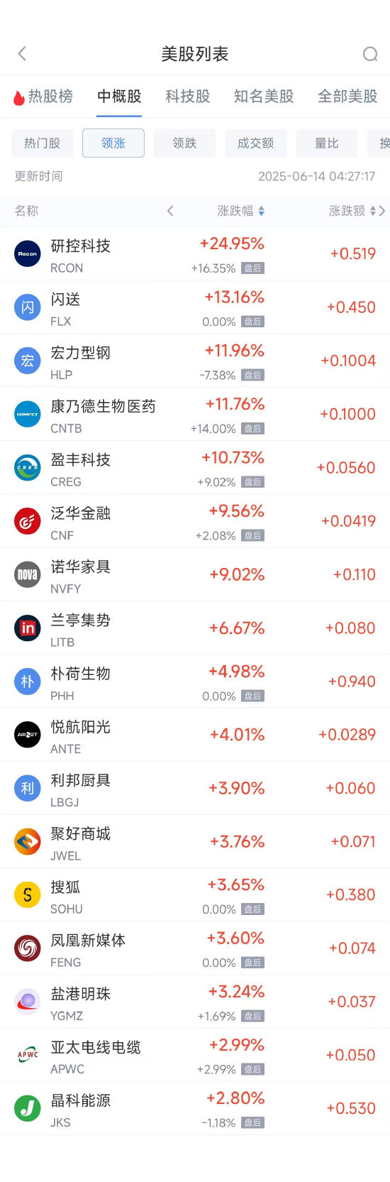 领涨中概股列表: