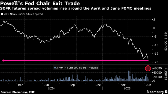 这一点在本周的担保隔夜融资利率(SOFR)期货中已有体现 —— 这是交易员押注美联储政策利率变动的主要方式。大量抛售2026年3月合约而买入2026年6月合约的操作,构成押注美联储将在此期间降息的交易策略。