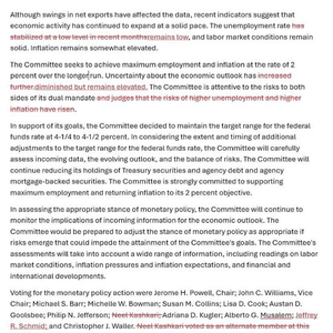 在点评经济时,和上次声明一样,本次声明也称:“虽然净出口波动已影响数据,但最近的指标显示经济活动继续稳健扩张。” 本次重申劳动力市场稳健、通胀依旧有所高企。
