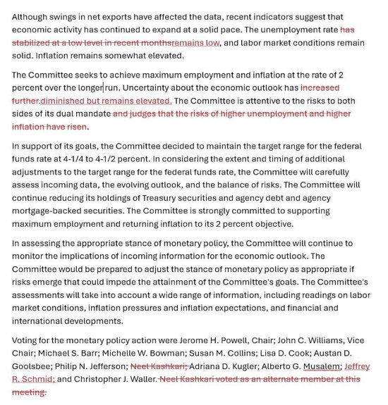 紧接着上面调整的这句话,本次声明再次重申,FOMC委员会专注于,在实现充分就业和价格稳定的双重使命上,所面临的两方面风险,然后作出了第二大变动。