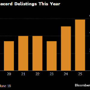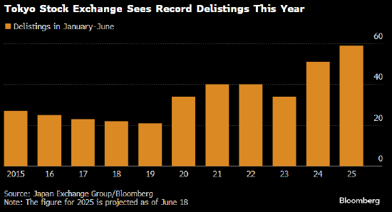 根据东京证交所2014年以来的数据,今年上半年已有59家公司从该交易所退市或宣布退市计划,高于去年同期的51家,也创下同期历史新高。若这一趋势持续,全年退市数量将超过2024年的历史纪录——即94家。