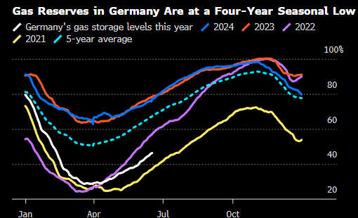 供应担忧正值欧洲天然气市场紧张之际,各国正争相在下一供暖季前补充耗尽的库存。由于库存量在冬季结束时降至2022年以来最低水平,该地区需要比往年更多地进口燃料。一些国家已设法增加储备,但作为欧洲最大经济体的德国仍落后于其他国家步伐。