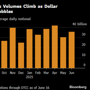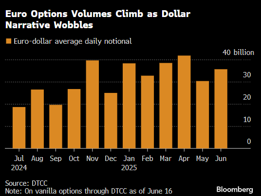 交易量已有了变化。对比美国存管信托及清算公司(DTCC)今年头五个月与2024年最后五个月的数据,可以看到约15%-30%与美元兑主要货币挂钩的合约已变成欧元。此外,还有迹象表明,欧元正被用作避险资产(传统上由美元扮演的角色),以及用于押注大幅波动。